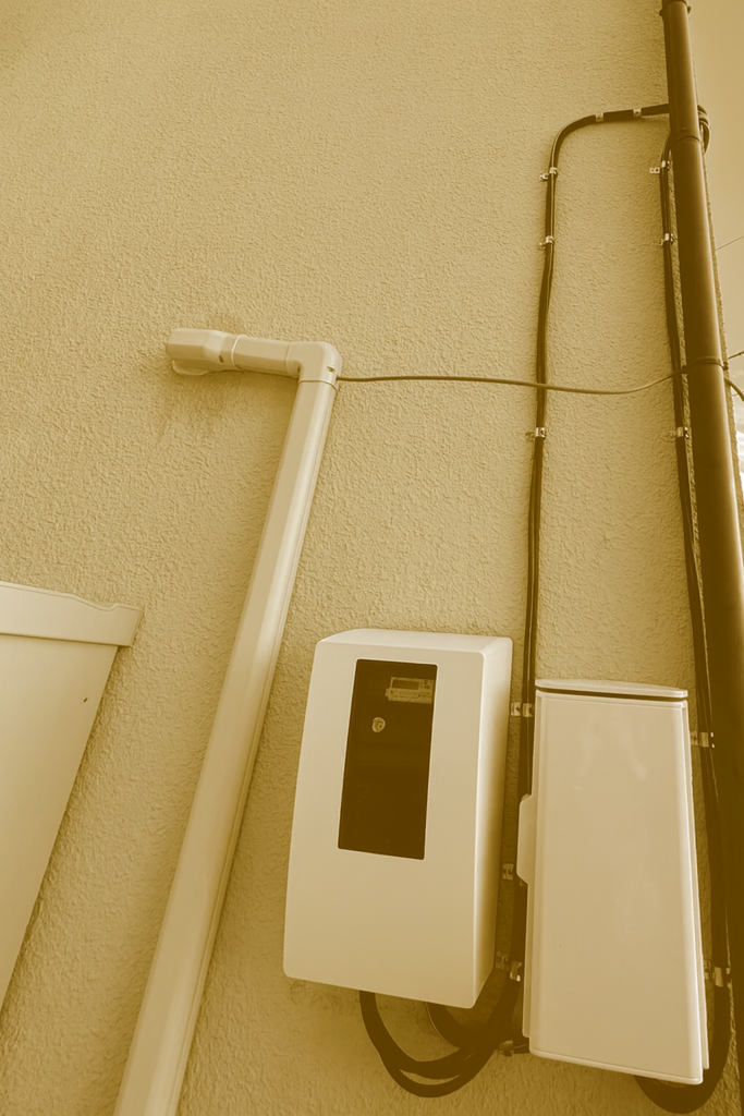 外壁には、電気メーターや古い電話機器、そして複雑に絡んだ配線が集中していました。