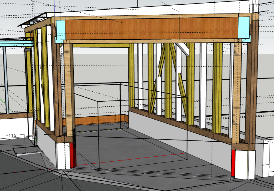 構造用合板(茶色い部分)を張り、門型フレームとして引き抜きに耐える